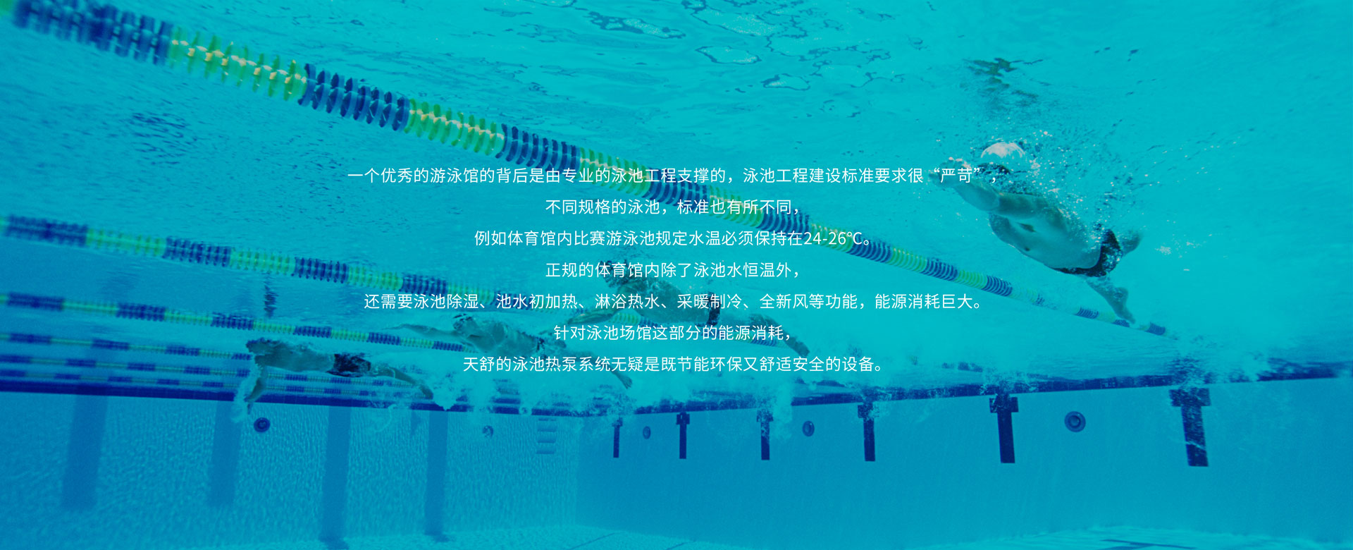 比賽游泳池對水溫要求較高,天舒泳池熱泵系統不僅能精確的控制水溫,而且相比傳統的加熱方式,可節約80%運行費用。